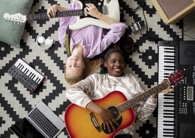 Dans l’espace ateliers, vous pouvez expérimenter différentes facettes de la musique. Découvrez le plaisir de jouer d’instruments, de créer des rythmes, d’écrire des chansons, de vous initier au chant ou au DJing.